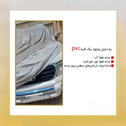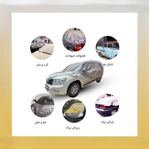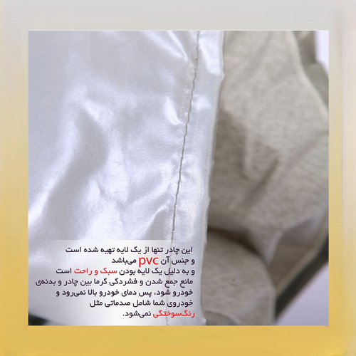 سایر توضیحاتدارای زیپ درب راننده - جای آینه -بازتاب دهنده نور خورشید - جلوگیری از داغ شدن بیش از اندازه داخل خودرو - غیرقابل نفوذ در برابر آب -محافظت خودرو از اشعه های مضر uv خورشید -جلوگیری از ایجاد آثار مخرب روی رنگ و بدنه خودرو